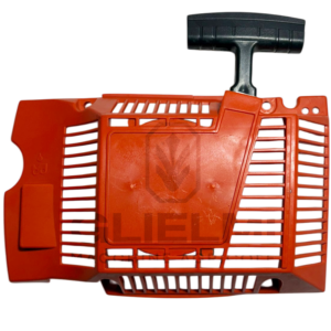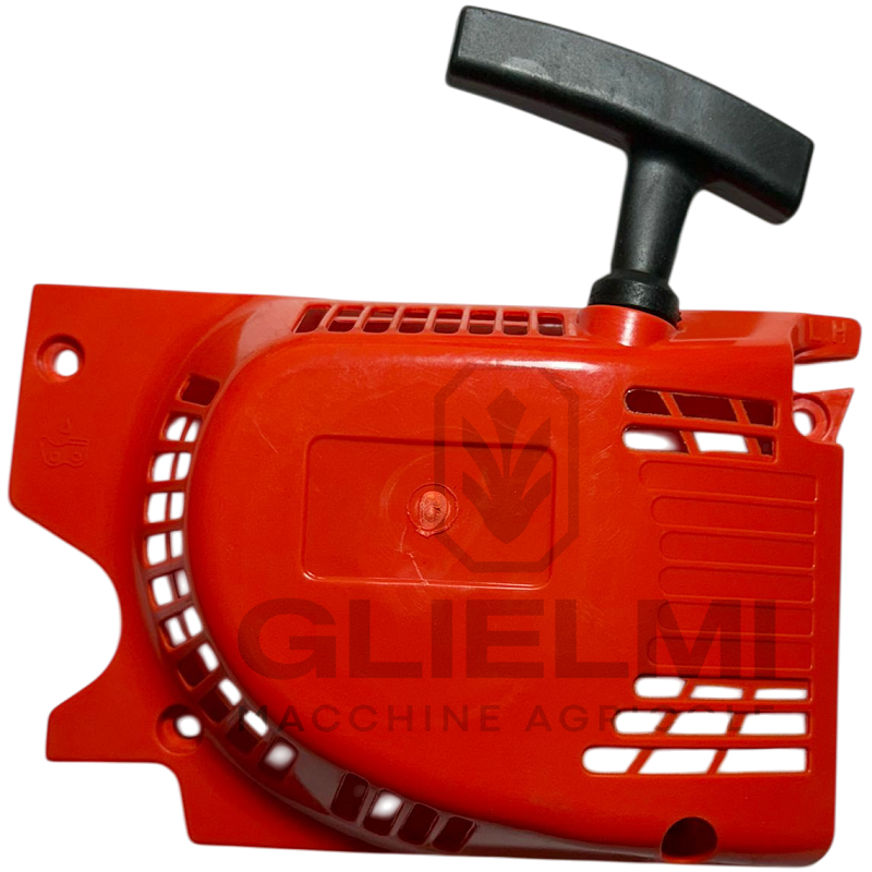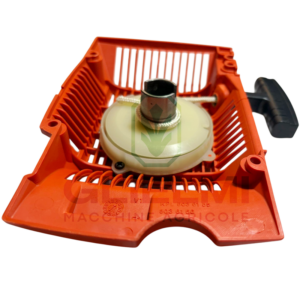Gruppo avviamento completo per motosega, progettato per avviare il motore a scoppio tramite la trazione manuale della fune. In particolare, il sistema trasforma il movimento in rotazione dell’albero motore, facilitando un’accensione progressiva e sicura anche a freddo.