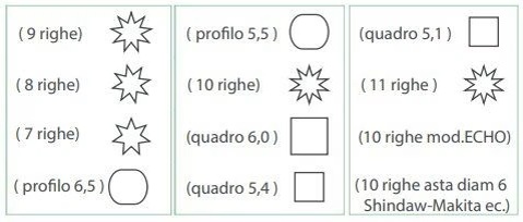 Prima di acquistare l’accessorio per il tuo decespugliatore controlla bene con un calibro se l’asta esterna del decespugliatore è del diametro adatto per questo attrezzo: 24 – 25 – 25.4 – 26 – 27 – 28 millimetri e controlla attentamente il profilo della trasmissione interna all’asta che deve essere dei seguenti tipi
